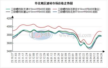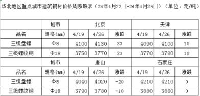 云商平台监测数据显示,截至4月26日午间,天津市场Φ18mm三级抗震螺纹钢价格为3780元,比上周同期价格涨10元;北京市场Φ18mm三级抗震螺纹钢价格为3770元,比上周同期价格涨20元;唐山市场Φ18mm三级抗震螺纹钢价格为3780元,比上周同期价跌10元;石家庄市场Φ18mm三级抗震螺纹钢价格为3880元,与上周同期价格持平。