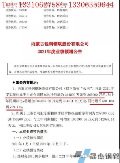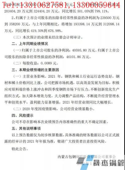 1月11日晚,钢铁板块的牛股包钢股份公布业绩预告,预计2021年度实现归属于上市公司股东的净利润为24.4亿元到36.5亿元,与上年同期相比,将增加20.34亿元到32.44亿元,同比增长501.05%到799.11%;归属于上市公司股东的扣除非经常性损益的净利润为23.95亿元到35.82亿元,与上年同期相比,将增加19.34亿元到31.21亿元,同比增长419.50%到676.98%。