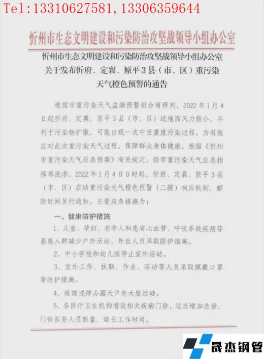 根据忻州市重污染天气监测预警组会商研判,2022年1月4日0时起 ,忻府、定襄、原平3县(市、区)启动重污染天气橙色预警(二级)响应机制,解除时间另行通知。相关强制性污染减排措施为: