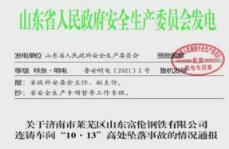事故情况:济南市莱芜区山东富伦钢铁有限公司连铸车间发生人员高处坠落事故,造成3人死亡、1人受伤。