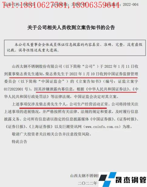 1月12日晚间,“不锈钢龙头”太钢不锈发布公告称,公司于2022年1月11日收到董事柴志勇先生通知,柴志勇先生于2022年1月10日收到中国证券监督管理委员会的《立案告知书》(编号:证监立案字0172022001号),因其涉嫌泄露内幕信息,根据相关法律法规,中国证监会决定对其立案。