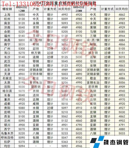 截至3月9日,全国主要城市20mm三级抗震螺纹钢均价5010元/吨,周环比上涨64元/吨;12mmHRB400三级抗震螺纹钢均价5157元/吨,周环比上涨63元/吨。以下为3月4日与3月9日全国重点城市螺纹钢价格指数对比情况: