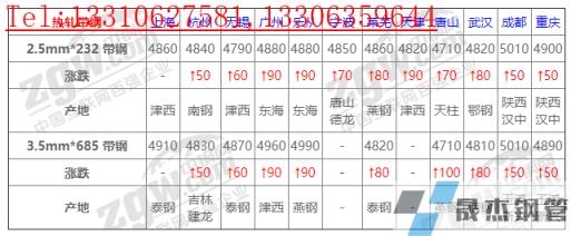 全国12个主要市场2.5mm*232 带钢平均价格4852元/吨,较上个交易日上调65元/吨。