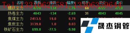 今日螺纹主力期货跌134,收报4728,跌幅2.76%;热卷主力跌134,收报4843,跌幅2.69%;焦煤主力涨19,收报2413.5,涨幅0.79%;焦炭主力涨1,收报3139,涨幅0.03%;铁矿石主力跌77.5,收报699,跌幅9.98%。