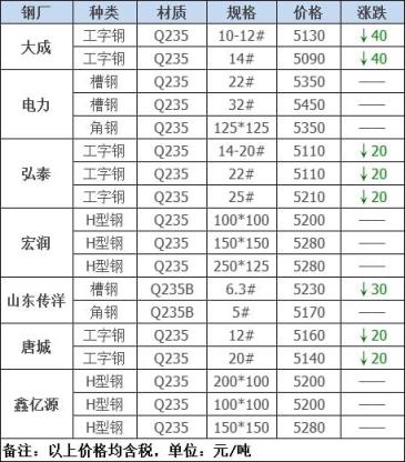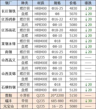 23日12:00起江阴西城刨花下调30-40,其他不变,调后:精炉料4000重废3890中废3830普通炉料3770钢筋头4000冲子3890-3940冷热轧料3790-3890炉料压块3600铁皮压块3300钢刨花3660数控刨花3570普通刨花3480刨花压块3420刨花长丝3360含税单位:元/吨。