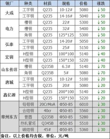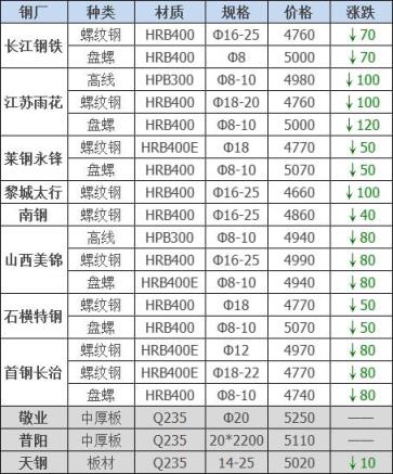 25日12:00起江阴西城刨花类下调50-60,其他不变,调后:精炉料4000重废3890中废3830普通炉料3770钢筋头4000冲子3890-3940冷热轧料3790-3890炉料压块3600铁皮压块3300钢刨花3600数控刨花3510普通刨花3420刨花压块3360刨花长丝3310含税单位:元/吨。