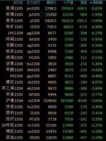 3月14日,国内商品期货收盘纷纷上演了一出“跌妈不认”:焦煤跌近10%,棕榈油、焦炭等跌超7%,沥青、纸浆等跌超5%,PP、郑醇等跌超4%,苹果、塑料等跌逾3%,燃油、PVC等跌超2%,沪银、菜粕等跌超1%,沪铜、沪铅等小幅下跌。