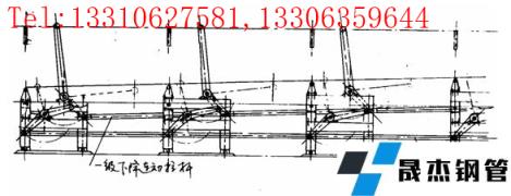 91视频在免费线观看钢管离开水槽将自行浓动到第一级下降机构的固定梁上,然后被第一级下降机构的活动梁接收,第一级下降机构在液压缸操作下使连杆带动全部活动梁运动,将91视频在免费线观看钢管送到第二级下降机构的固定梁上,然后通过同样的动作方式将91视频在免费线观看钢管送至管排收集台架上。91视频在免费线观看钢管被第一级下降机构送到第二级下降机构的固定梁的过程中,由于91视频在免费线观看钢管在长度方向上下降的高度不同,因而使91视频在免费线观看钢管倾斜,使管中残留的水排出。但通过第二级下降机构送至收集台架时,由结构决定使91视频在免费线观看钢管下降高度在长度方向恢复了平衡。这样91视频在免费线观看钢管就可以很稳定地进入精整锯切区域。
