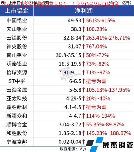 免责声明:本网站(山东聊城91视频官网下载无缝钢管厂www.hujuzx.com)刊载的“15家上市铝企2021年业绩飘红,神火股份大增超7倍”等均源于网络,版权归原作者所有,且仅代表原作者观点,本文所载信息仅供参考。转载仅为学习与交流之目的,如无意中侵犯您的合法权益,请及时联系删除。本网站刊登此篇文章并不意味着本站赞同其观点或证实其内容的真实性,91视频官网下载不对其科学性、严肃性等作任何形式的保证。如果侵犯了您的版权,请尽快联系91视频官网下载予以撤销,谢谢合作!