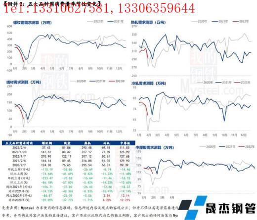 分品种来看,长板双降,但板材降幅更加突出。从农历同比来看,长材和板材分别同比低7.2%和11.8%。可见,板材在冬奥会限产和冬季采暖季限产期间影响较建材偏高。另外,由于建材品种受季节性影响较大,在节前已有大比例的减产,且集中于电炉和调坯企业,但节中部分长流程企业保持正常生产状态,因此建材整体变化不大。而板材品种季节性表现并不突出,因此供应减量主因基本在于例检和限产。综合来看,因部分企业节后执行减限产计划,后期仍有减量预期,但空间有限。