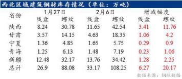 截至到2月6日,据不完全统计,西北区域社会总库存约在141.42万吨,与节前(1月27日)相比,周环比增加26.44万吨。分区域来看,陕西、新疆和甘肃区域社库分别增加15.17万吨、3.53万吨和5.26万吨,而宁夏和青海区域社库则增幅较少,分别增加1.19万吨和1.29万吨。