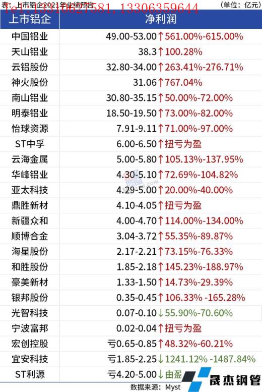 免责声明:本网站(山东聊城91视频官网下载无缝钢管厂www.hujuzx.com)刊载的“23家上市铝企披露2021年业绩预报,超8成净利润增长”等均源于网络,版权归原作者所有,且仅代表原作者观点,本文所载信息仅供参考。转载仅为学习与交流之目的,如无意中侵犯您的合法权益,请及时联系删除。本网站刊登此篇文章并不意味着本站赞同其观点或证实其内容的真实性,91视频官网下载不对其科学性、严肃性等作任何形式的保证。如果侵犯了您的版权,请尽快联系91视频官网下载予以撤销,谢谢合作!