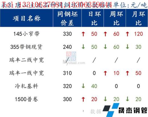 145带钢与钢坯价差拉大,小窄带涨幅高于钢坯上涨速度,调坯轧材厂仍在停产。焊管与355带钢价差较昨日持平,热卷与带钢价差扩大,卷带差修复。