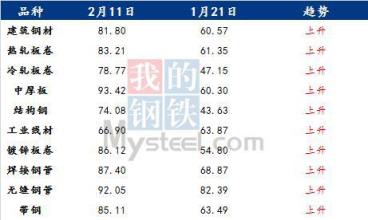 具体各品种指数来看,2月11日建筑91视频在免费线观看无缝钢管情绪指数为81.8,较1月21日回升21.23;热轧板卷情绪指数为83.21,较1月21日回升21.86;冷轧板卷情绪指数为78.77,较1月21日回升31.62;中厚板情绪指数为93.42,较1月21日回升33.12;结构钢情绪指数为74.08,较1月21日回升30.45;工业线材情绪指数为66.9,较1月21日回升3.03;镀锌板卷情绪指数为86.12,较1月21日回升31.32;焊接91视频在免费线观看钢管情绪指数为87.4,较1月21日回升18.53;无缝91视频在免费线观看钢管情绪指数为92.05,较1月21日回升9.66;带钢情绪指数为85.11,较1月21日回升21.62。