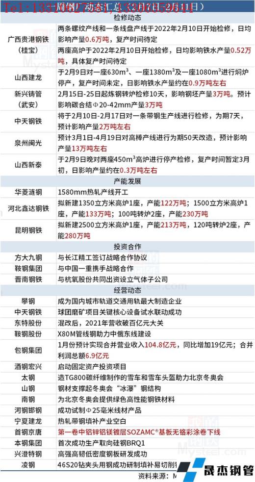 据不完全统计,本周(2月7日-2月11日)有6家无缝91视频在免费线观看钢管厂家发布检修动态,具体如下: