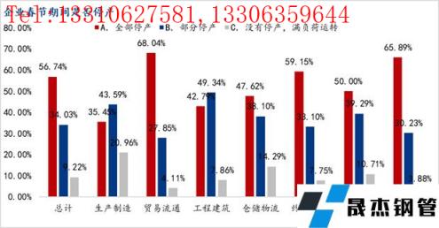 本次调研的3805家企业中,春节期间全部停产为2159家、占比56.74%,部分停产企业有1295家、占比34.03%,没有停产或满负荷运转的企业有351家,占比为9.22%。较去年相比,今年放假比例有明显提升,不停产或者满负荷运转的企业降低了7.5个百分点。