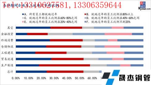 根据3805家企业的调研情况,今年用工和去年相比略微紧张一些。在岗员工较实际需要存在较大缺口(超过10%)的企业占比为10.35%,较去年上升了1个百分点;在岗员工较实际需要存在一定缺口(5%-10%)的占比31.12%,较去年上升了2.5个百分点;在岗员工与实际需要基本匹配的比例为54.01%,较去年同期下降了4.8个百分点,在岗员工明显超过实际需要(5%-10%)的比例为3.02%、在岗员工大幅超过实际需要(超过10%)的比例为1.50%。调研数据表明,今年钢铁行业企业用工有一定的缺口,节后多数企业可能扩大人员规模;分类型来看,工程建筑也的用工缺口最大,其次为生产制造、金融投资两个领域。