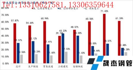 本次调研的3805家钢铁企业中,已全部复工企业2202家,已经部分复工企业1125,尚未复工企业478,占比分别为57.87%、29.57%、12.56%。同期相比,已经复工企业较去年降低了8个百分点,尚未复工企业比例增加1个百分点,部分复工企业占比上升较为明显。