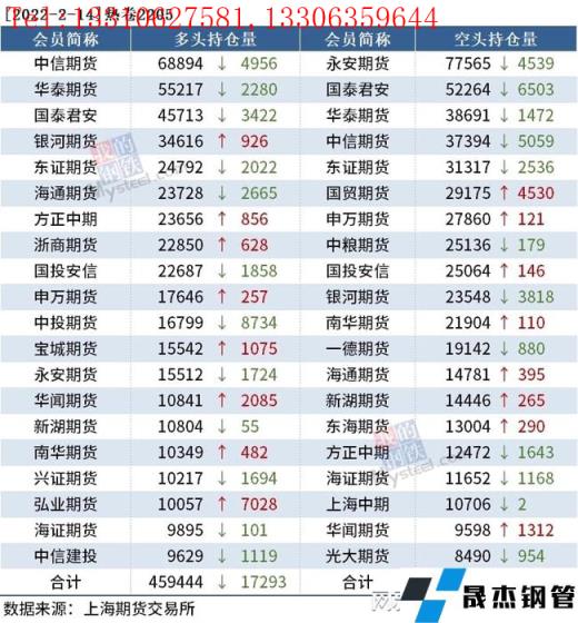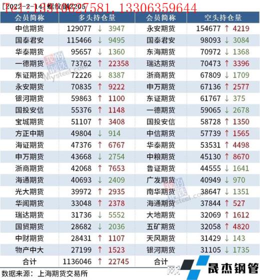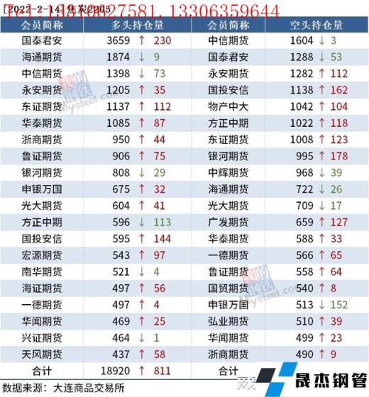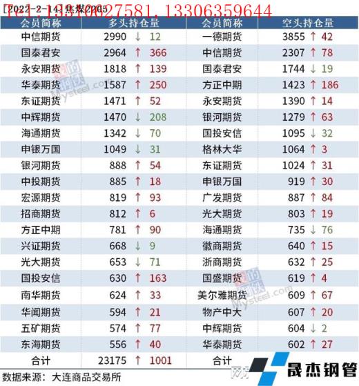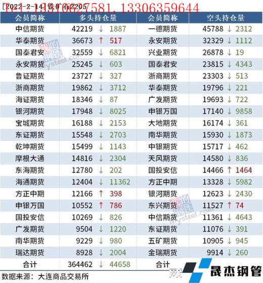 截至2月14日收盘,螺纹钢2205收4817元/吨,跌3.39%;热卷2205收4928元/吨,跌3.54%;铁矿石2205收776.5元/吨,跌6.84%。