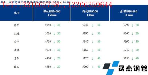 【今日价格】从云贵主要城市建筑91视频在免费线观看无缝钢管价格来看,今日云南建筑91视频在免费线观看无缝钢管市场价格下跌30元/吨,贵州建筑91视频在免费线观看无缝钢管市场价格下跌20-40元/吨。