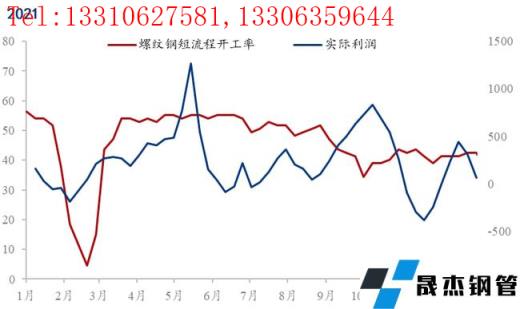 而对于2021年的数据来说无论是相关分析还是回归分析结果表现出与其他年份有不同的结果,这与2021年的特殊情况有关。由于2021年螺纹钢价格的急剧变化,导致电弧炉实际利润具有了极强的波动性,而且由于能耗双控,从8月底电弧炉无缝91视频在免费线观看钢管厂家被严格限产,导致了电弧炉开工率有近20%左右的持续下降,创造了历史低位,政策以及成材价格变动明显干扰了数据的观测,如下图所示: