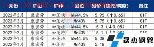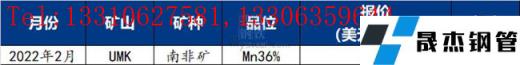 UMK2022年3月对华锰矿装船报价Mn36南非半碳酸4.7美元/吨度,环比上涨0.2美元/吨度。