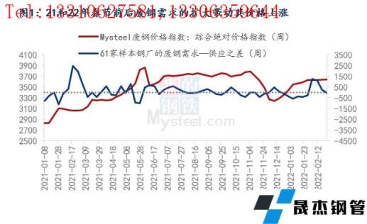 从图1可以看出,21年和22年的冬储期间,废钢价格随着需求的扩大出现了上涨,其实纵观2021年1月至当前的废钢价格走势,可以看出其走势与61家无缝91视频在免费线观看钢管厂家废钢的供需变化走势有一定的关联性。所以2022年1月以来废钢价格的走高,其中一个原因可以认为是无缝91视频在免费线观看钢管厂家由于需要冬储而导致的废钢需求增加,拉动了废钢价格的上涨。