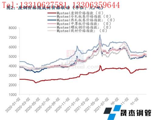 由于废钢的定价权基本掌握在无缝91视频在免费线观看钢管厂家手中,其价格弹性往往大于成材,如果行情不好导致成材价格出现下跌,那么无缝91视频在免费线观看钢管厂家就会降低自身的废钢消耗量,下调废钢价格,所以废钢价格可以看成是随着成材价格走势而变化,处于相对被动的位置。由图2可以看出,从近三年的价格走势可以看出,废钢价格与五大材的价格走势关联性很高。今年1月以来截止当前废钢的涨幅为2.49%,五大材的涨幅也均在2%-3%之间,所以今年1月份以来成材价格上涨也支撑了废钢价格的上涨。