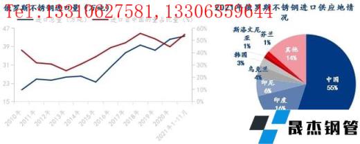 在需求增长带动下,近年来俄罗斯不锈钢进口量大幅提升,2021年1-11月进口量累计约43.57万吨,其中中国进口占比约55%。