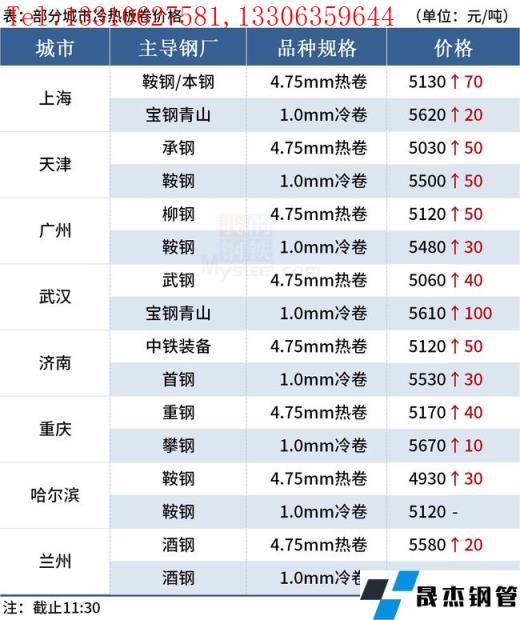 ◎天津:2日早盘冷轧市场价格涨50,1.0天铁5510首钢5560唐钢5490包钢5510,成交一般。(单位:元/吨)