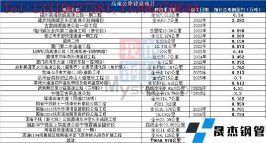未来2-3年福建省高速公路在建新建线路总长约668.978公里,据不完全统计预计总用钢量约30.235万吨左右。