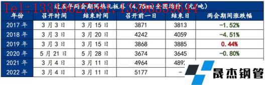 通过以上数据来看,在近五年两会期间热轧板卷的全国均价除了2019年价格有小幅的上涨外,大多数年份呈现下跌的趋势,其中2018年跌幅较大,达到了4.51%;2017年与2021年价格降幅分别为1.52%和1.47%。