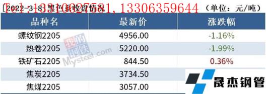 截至3月8日收盘,螺纹钢2205收4956元/吨,跌1.16%;热卷2205收5220元/吨,跌1.99%;铁矿石2205收844.5元/吨,涨0.36%。