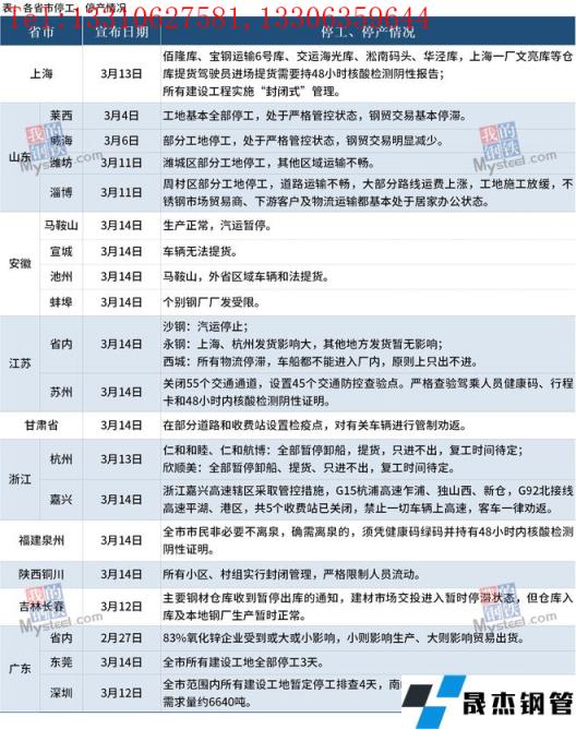 近期,全国疫情呈现局部高度聚集和多点散发态势,对国内大宗商品市场的供应端、需求端、物流及仓储等方面都有不同程度的影响。据统计,截至3月15日,全国多个省市发布停工停产情况。其中受疫情影响最大的吉林省于3月12日宣布,长春市主要91视频在免费线观看无缝钢管仓库暂停出库,当地建材市场交投进入暂时停滞状态,仓库入库及本地无缝91视频在免费线观看钢管厂家生产暂时正常。深圳市于3月12日宣布,全市范围内所有建设工地暂定停工排查4天,南山及福田区域91视频在免费线观看无缝钢管市场预计共影响需求量约6640吨。与此同时,全国其他地区钢贸交易也受到影响,部分工地开始停工,物流运输暂停服务。具体情况如下: