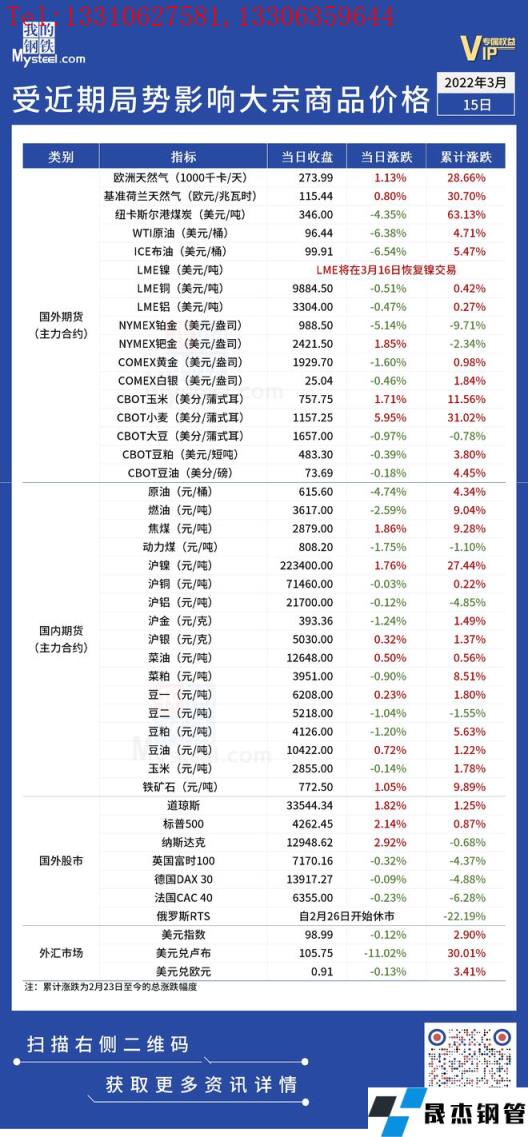 近期,受国际局势影响,全球金融及大宗商品市场出现较大波动。3月15日,国际能源价格继续大跌,WTI原油与布油均降至100美元以下。汇总情况如下:
