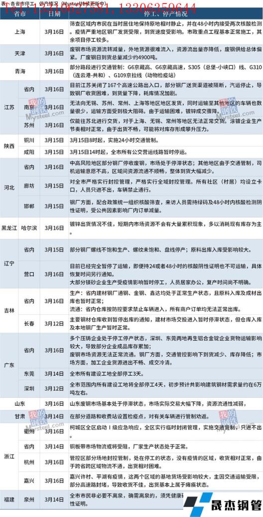 截至3月17日,汇总14个省份停工停产最新信息。其中,上海市疫情严重地区无缝91视频在免费线观看钢管厂家发货受限,到货速度受影响;市政重点工程基本正常施工,其余项目停工较多。河北省内中高风险地区部分无缝91视频在免费线观看钢管厂家停收废钢 ,市场处于停滞状态;其他地区由于交通管制,司机运输意愿不高,区域间资源流通不顺畅,整体到货大幅减少。广东省内多个压铸企业处于停工停产状态,深圳、东莞两地再生铝合金锭企业货物运输影响较大,导致部分企业成品库存累加;吉林省省内建材无缝91视频在免费线观看钢管厂家通钢、金钢、鑫达均处于正常生产状态,且原料入库及成材出库也暂时正常;省内仓库按防控要求禁止车辆进入,所有商户订单均无法正常出库。具体情况如下: