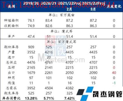 其二:南美大豆减产之后,美国大豆出口环境向好。3月份USDA供需报告数据显示,考虑到南美大豆减产之后,美国旧作大豆出口数量上调0.4亿蒲至20.9亿蒲,最终令2021/2022年度美国大豆结转库存落至2.85亿蒲,库消比6.45%。美国大豆结转库存的继续走低,令美国大豆旧作平衡表不断收紧,对CBOT大豆近月合约价格提供了一定支撑;且近三个月来由于美国大豆结转库存的不断走低,与全球大豆去库节奏形成共振,而非此前的拖累。
