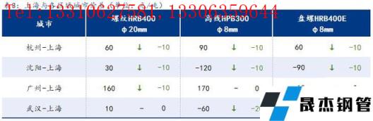 以主要品种螺纹钢来看,上海市场与杭州价差日环比小幅收窄,价差为-60元/吨。上海市场与华南区域价差日环比小幅收窄,价差为-160吨。上海市场与东北区域日环比价差小幅收窄,价差为-30元/吨。上海市场与华中区域价差日环比持平,价差为-10元/吨。