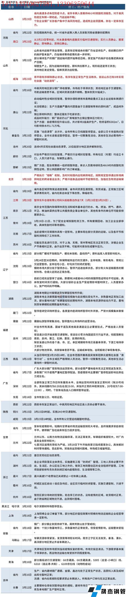 截至3月24日,汇总了20个省份停工复工最新信息。其中,3月23日,山西省内高速多点布控防疫卡点,省外车辆入晋需持48小时核酸检测报告,对于高风险疫区车辆一律劝返,汽运运输不畅;个别企业无缝91视频在免费线观看钢管厂家长协客户集中于高风险地区,造成焦企出货困难,存在一定库存压力。河南周口从3月23日零时起,对太康县域内道路实行临时交通管制;实行人员静止、居家静止、原地静止、原岗位静止。山东威海于3月23日将平稳有序解除静止状态,有序恢复正常生产生活秩序,目前山东已有8市实现社会面“动态清零”。具体情况如下: