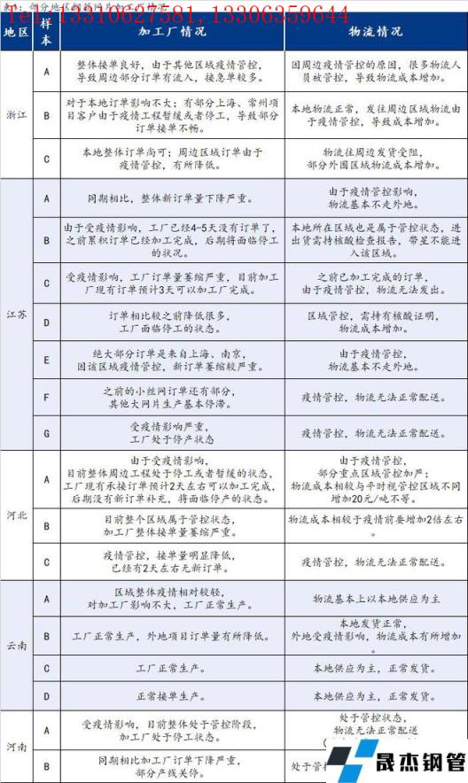 截至3月23日,汇总了部分省份19家钢筋网片加工厂最新信息,其中浙江3家,江苏7家,河北3家,云南4家,河南2家。从调研结果来看,江苏、河北、河南受疫情影响较严重,因工程项目停工或者暂缓对于网片需求整体有递延,导致加工厂新订单相较于往年有个明显的萎缩,部分没有受太大影响的区域物流成本也有相应的增加。具体情况如下:
