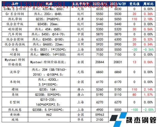 截止2022年5月6日,各原材料当日即时价格以及价格周环比情况如下: