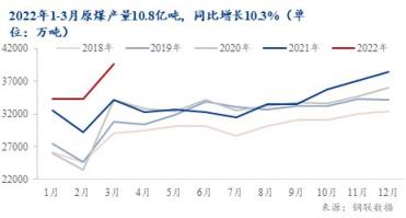 2022年1-3月全国原煤产量累计生产10.8亿吨,同比增长10.3%,其中3月份原煤产量3.96亿吨,同比增长14.8%。国家能源局3月发布《2022年能源工作指导意见》,提出将着力增强国内能源生产保障能力,切实把能源饭碗牢牢地端在自己手里。