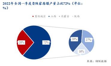 在经历去年下半年用煤紧缺情况下,《2030年前碳达峰行动方案》中提出,应以保障国家能源安全和经济发展为底线,推动能源低碳转型平稳过渡,稳妥有序、循序渐进推进碳达峰行动,确保安全降碳。因此展望2022年,煤炭供应将会保持当前较高增长趋势,尤其作为全国煤炭生产核心产区的晋陕蒙地区,在全国一季度原煤产量占比中,依然保持72%以上的占比。其中,山西、内蒙古和陕西分别占比29%、27%和16%,内蒙古产量占比同比增长1.2%,产量同比增加约4000万吨。