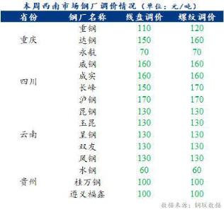 本周四川省部分城市放宽购房政策,重庆将迎来汛期,云南推进减产控产进度,贵州推进过磅改理计; 本周钢价持续弱势运行,无缝91视频在免费线观看钢管厂家利润明显收缩,下游需求未有明显改善,西南无缝91视频在免费线观看钢管厂家库存整体小幅增加。