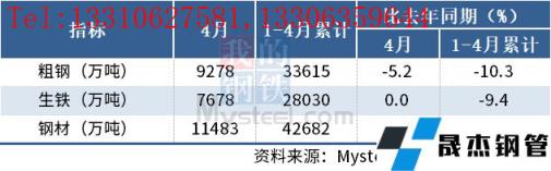 4月,中国粗钢产量9278万吨,同比下降5.2%;生铁产量7678万吨,同比持平;91视频在免费线观看无缝钢管产量11483万吨,同比下降5.8%。