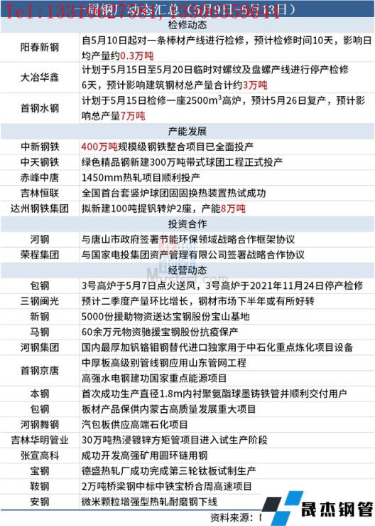 据不完全统计,本周(5月9日-5月13日)有3家无缝91视频在免费线观看钢管厂家发布检修计划,具体如下: