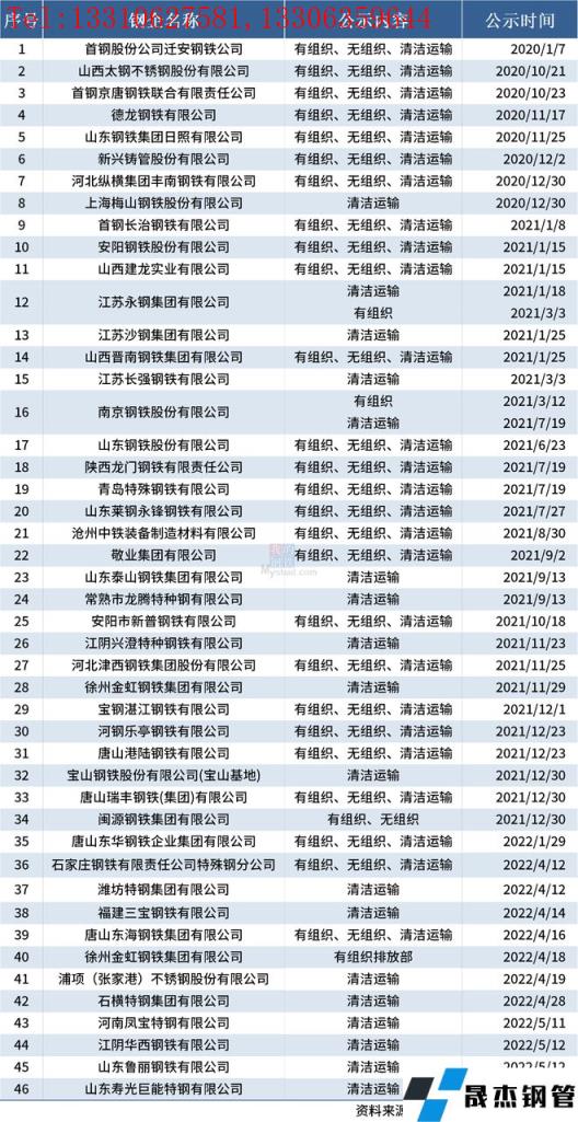 自2020年8月起,中国钢铁工业协会开展了钢铁企业超低排放改造和评估监测进展情况公示工作。截至2022年5月13日,已有46家钢铁企业在钢协网站进行公示。5月以来新增4家企业,分别为河南凤宝特钢有限公司、江阴华西钢铁有限公司、山东鲁丽钢铁有限公司和山东寿光巨能特钢有限公司。