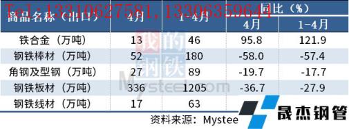 4月,中国出口钢铁棒材52万吨,同比下降58.0%;1-4月累计出口180万吨,同比下降57.4%。其他出口情况如下表所示: