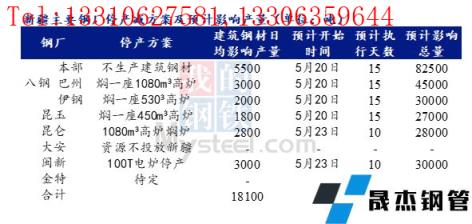 据不完全统计,截至5月20日,国内13家无缝91视频在免费线观看钢管厂家发布检修计划。其中,中天钢铁因一座转炉检修,坯料不足,两条棒材线停产检修,预计5月份影响棒材产量4.5万吨。