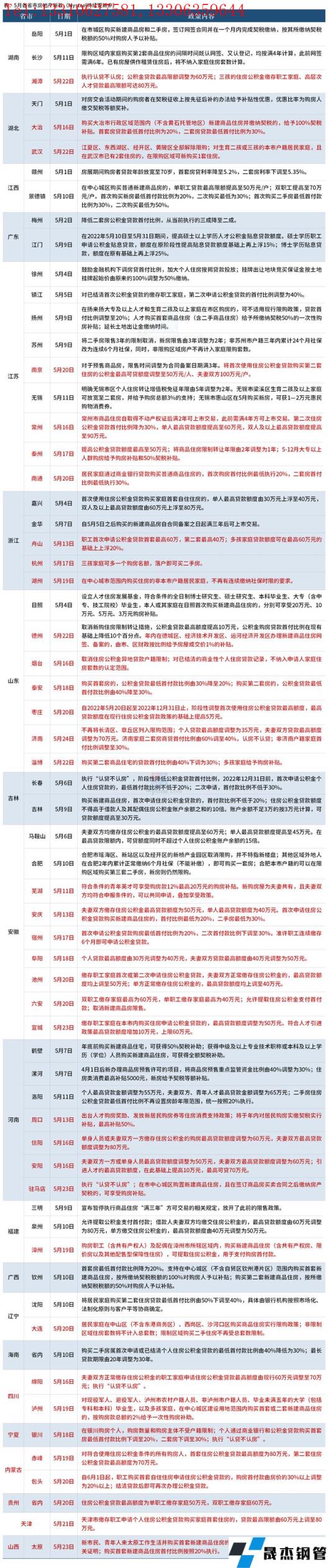 据不完全整理,截至5月24日,已有超60城发布了稳楼市政策,包括降首付、公积金贷款额度提升、给予购房补贴、取消限购等。同时多地开始尝试将稳楼市与人口政策及人才政策等其他政策相结合,在一定程度上鼓励生育、促进人口增长,有利于各地吸引人才就业,预计后续将有更多城市跟进。具体调整情况如下: